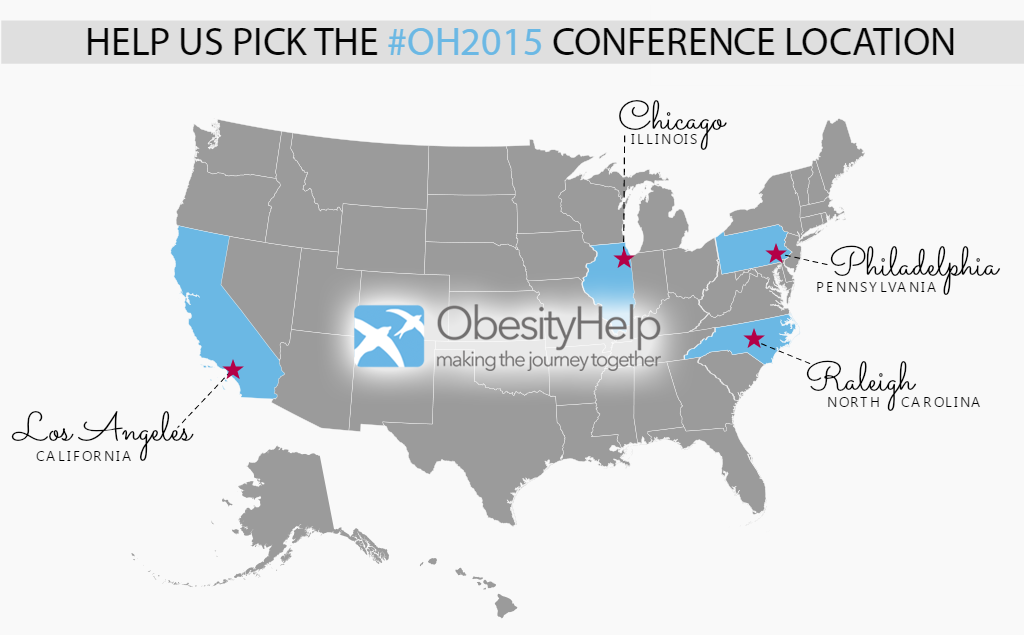 We've narrowed down the next ObesityHelp Conference #OH2015 to Chicago, Philadelphia, Los Angeles or Raleigh. Take this short survey and help us pick! We’ll be taking form submissions until December 30th. Once we’ve looked over the survey responses, a final location will be announced in January!