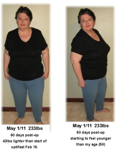 I hope this works, its my first attempt at posting photos in my message. Today I am 60 days postop. I am 43 pounds lighter than when I started my optifast Feb 16/11. I am starting to feel great. I am 58 but feel younger than I have in years. I walked 3.2 miles on one of my walks outdoors this week, without feeling short of breath or tired, and it was not that long ago that I could not walk 2 blocks without being winded and sweating like crazy. The pictures do not reflect a massive reduction in my body size but its a SLOW but SURE improvement. I only wish I had had the courage to seek out WLS years ago!
