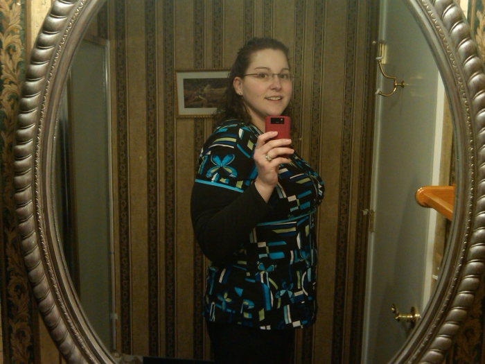 In my snazzy new XL ladies scrubs! In true photo***** fashion, this pic was taken in the bathroom mirror at work. How cheesy. LOL But hey, I was feeling cute.
