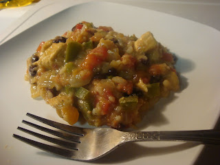What is it? It's my Fiesta Chicken and "Rice" skillet. It takes about 20 minutes to make and you get the added bonus of watching your kids lap up vegetables in spite of themselves.